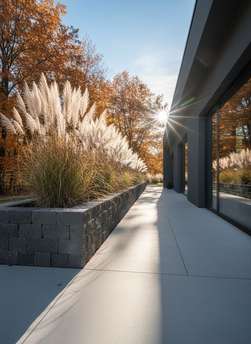 Plant your Pampas grass (or a non-invasive ornamental grass alternative) at regular intervals along a wall or fence. Surround the base of the plants with a thick layer of medium-sized grey slate chips or river stones. The stones act as a mulch, retaining soil moisture for the grass while suppressing weeds. This low-maintenance setup looks good year-round, with the dried grasses adding winter interest against the stone.