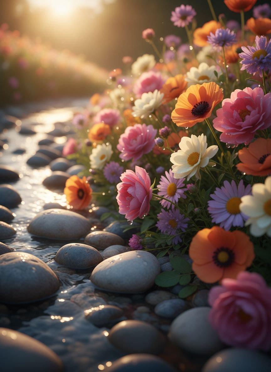- Colorful Wildflower Border with Smooth River Pebbles