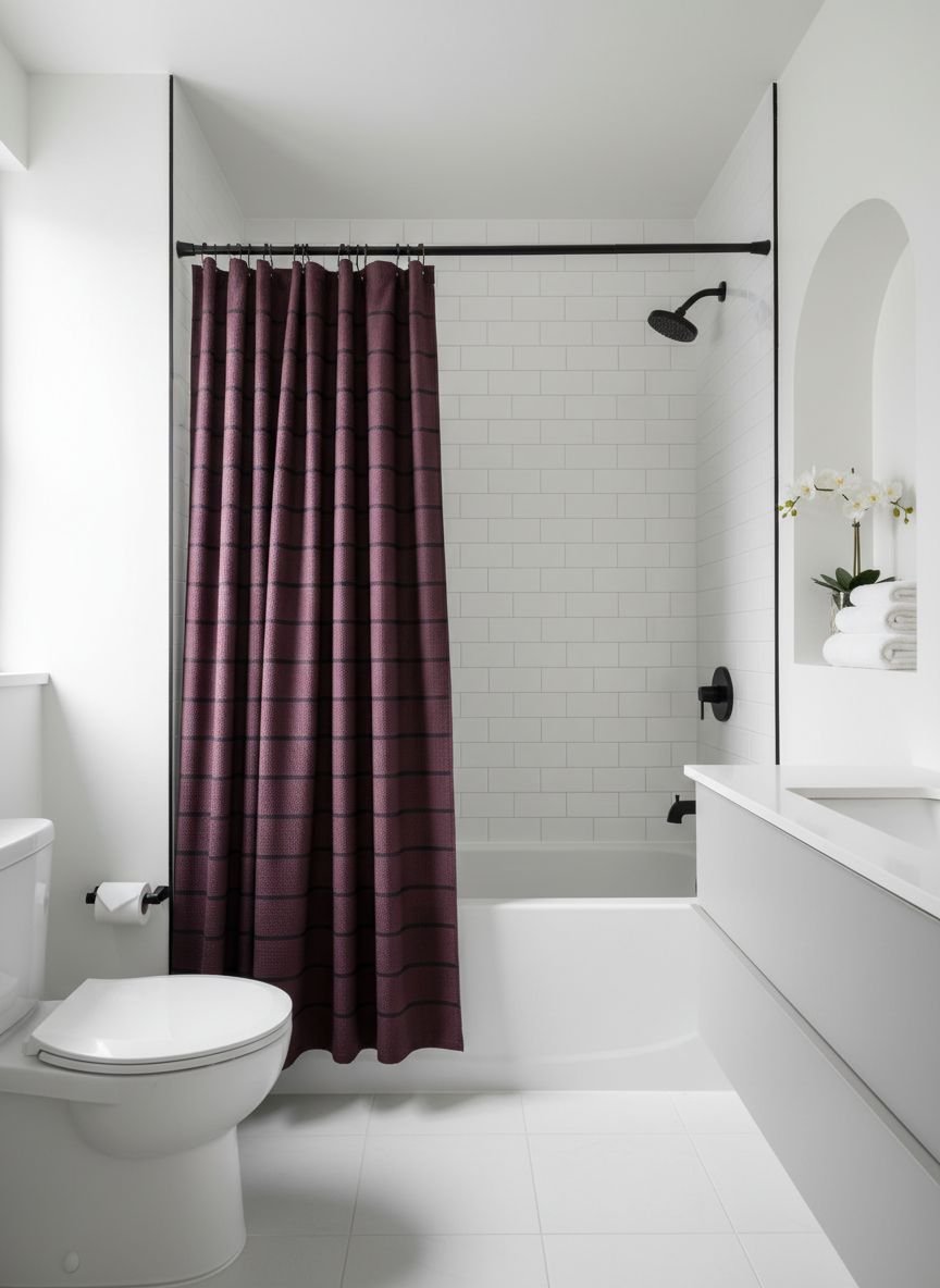 The shower curtain is the largest vertical surface in many bathrooms, acting as a “removable wall.” Swapping a plain white liner for a burgundy curtain instantly changes the room’s palette. Fabric choice is key here. A waffle-weave cotton curtain adds spa-like texture, while a velvet or heavy linen curtain adds drama and weight.