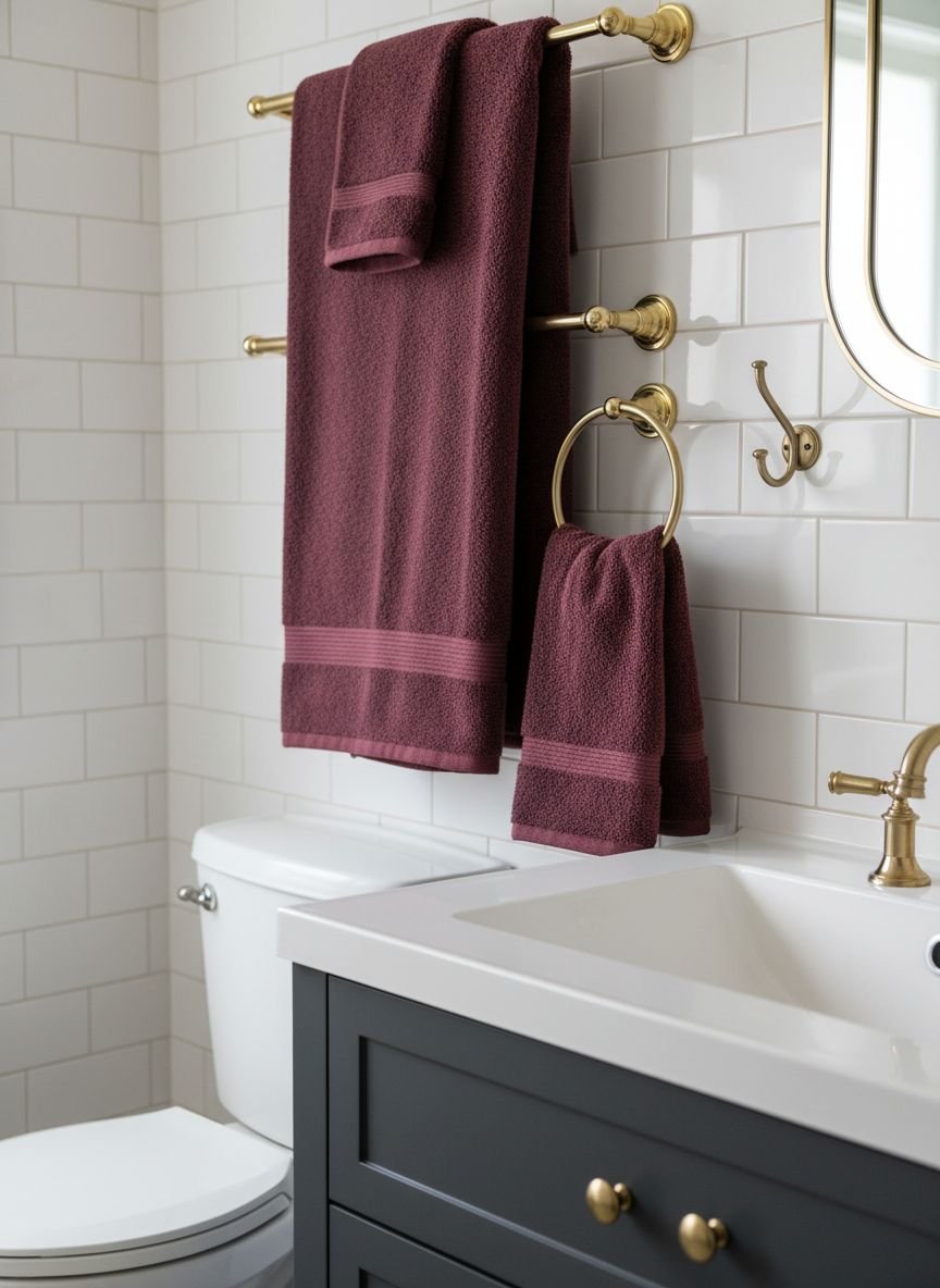 Invest in high-quality cotton that creates a fluffy loop. Cheap, thin towels will look sad and limp against the bold design statement you are trying to make. Monogramming your burgundy towels in gold or white thread adds a personalized, high-end touch that elevates the entire room. Even if your bathroom is entirely white, a set of burgundy towels and a matching bath mat can introduce the trend for under $100.