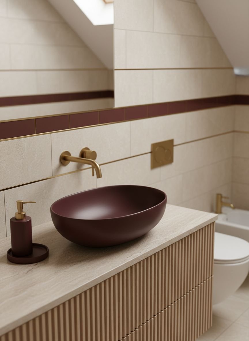 When using dark floor tiles, keep the grout color in mind. White grout creates high contrast and highlights the shape of the tile, while dark grey or burgundy grout creates a seamless, carpet-like effect. If you choose a busy floor pattern, keep the walls solid to avoid visual chaos. A burgundy floor pairs beautifully with white subway tile walls or simple cream plaster. It hides dirt better than white tile, making it a practical choice for family bathrooms.