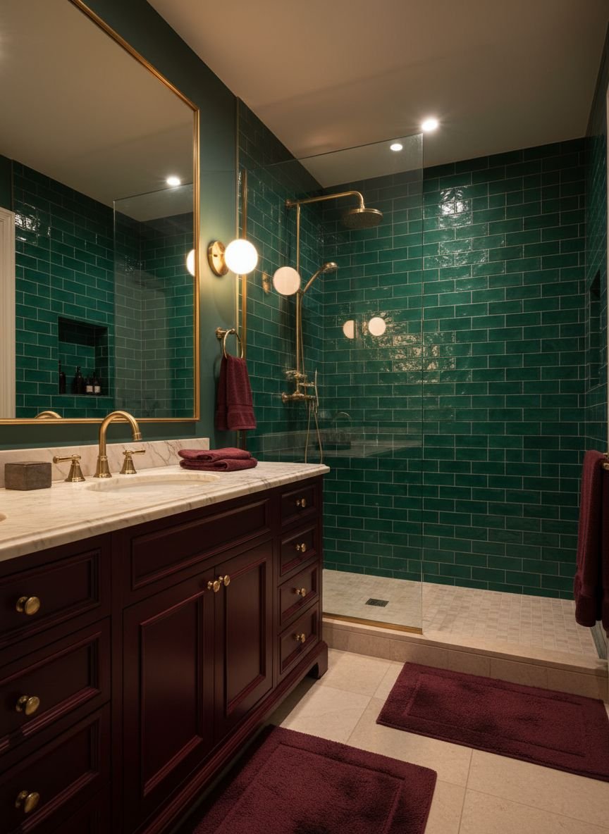Incorporating natural elements helps ground these strong colors. A dark walnut vanity or wood-look floor tiles provide a neutral resting place for the eye. Use emerald for the shower tiling, perhaps in a fish scale or subway pattern, and reserve the burgundy for the painted walls or a statement velvet vanity chair. Brass fixtures are essential here; silver or chrome can look too cold and disjointed against such rich saturation. This style demands confidence but rewards you with a space that feels curated and intensely personal.