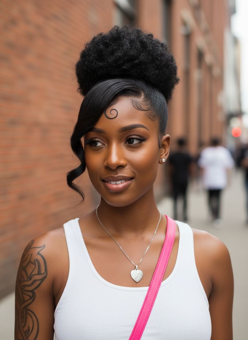 Use a satin scrunchie or a spiral cord tie to loosely secure the hair at the very front crown of your head. Do not tie it tight—you want the curls to spill forward over your forehead and sides. This style shows off the volume and definition of your natural texture while keeping the hair off your neck. It is edgy, cool, and incredibly healthy for your hair.