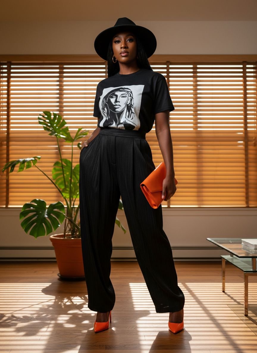 - All-Black Ensemble with Bold Orange Heels 2026