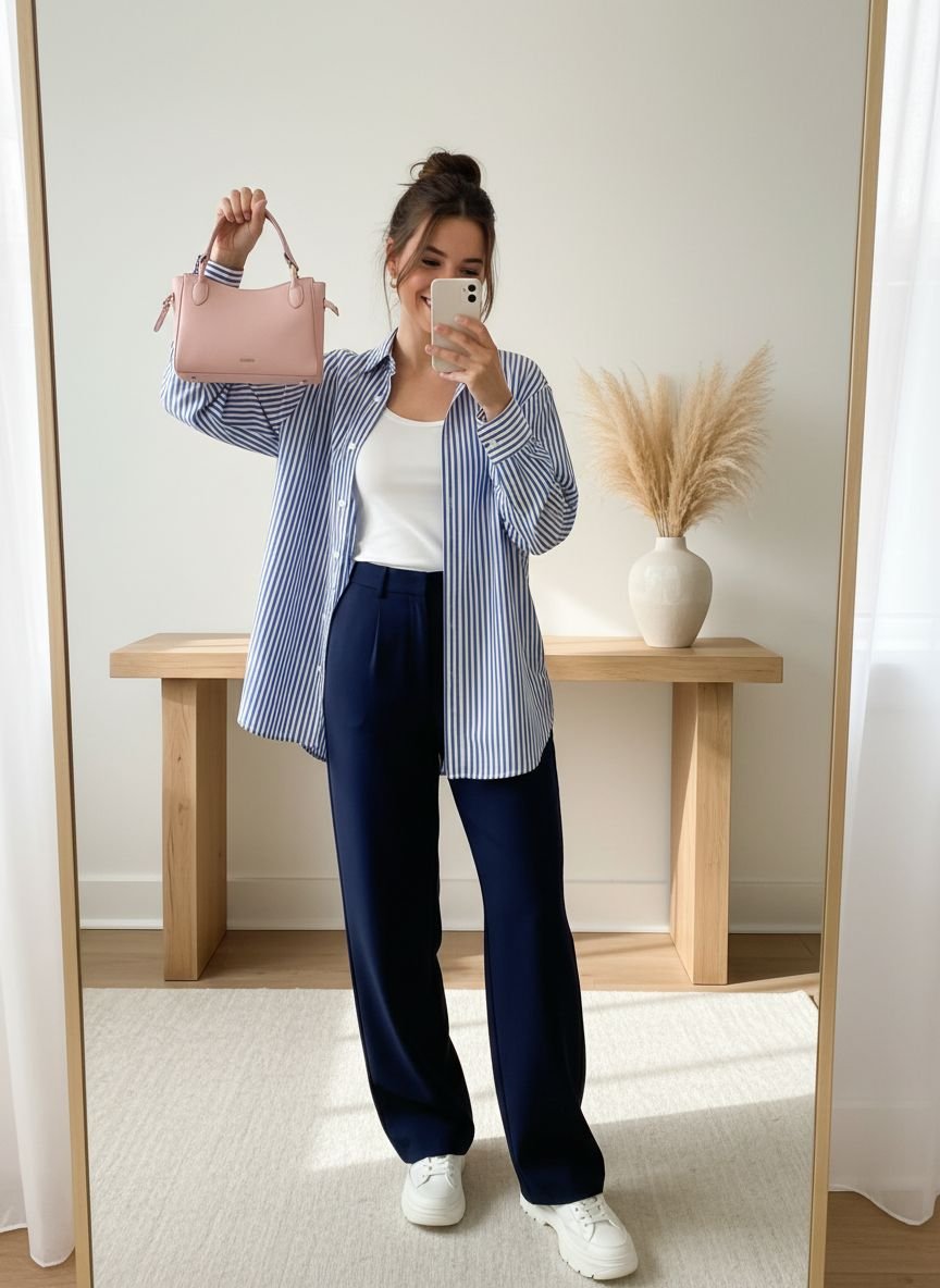 Taking the stripe trend a step further, the oversized button-down shirt is a wardrobe staple for 2026. When paired with wide-leg pants (distinct from jeans—think trousers or linen blends), it creates a silhouette that is all about drape and flow. This look is heavily influenced by the “borrowed from the boys” aesthetic but tailored for a woman’s body. The vertical stripes on the shirt combined with the long line of the pants create an incredibly elongating effect.