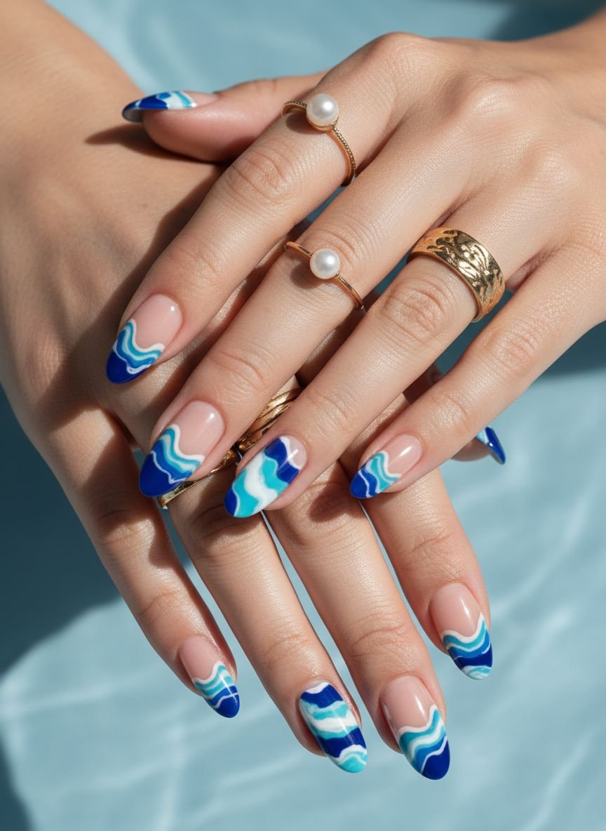The key to mastering this look is the layering technique. By mixing opaque white polish with a clear top coat, you can create a semi-transparent “sea foam” effect that sits on top of the darker blue swirls. This adds depth and realism, making your nails look like moving water. It is sophisticated enough for a dinner date but playful enough for the beach.