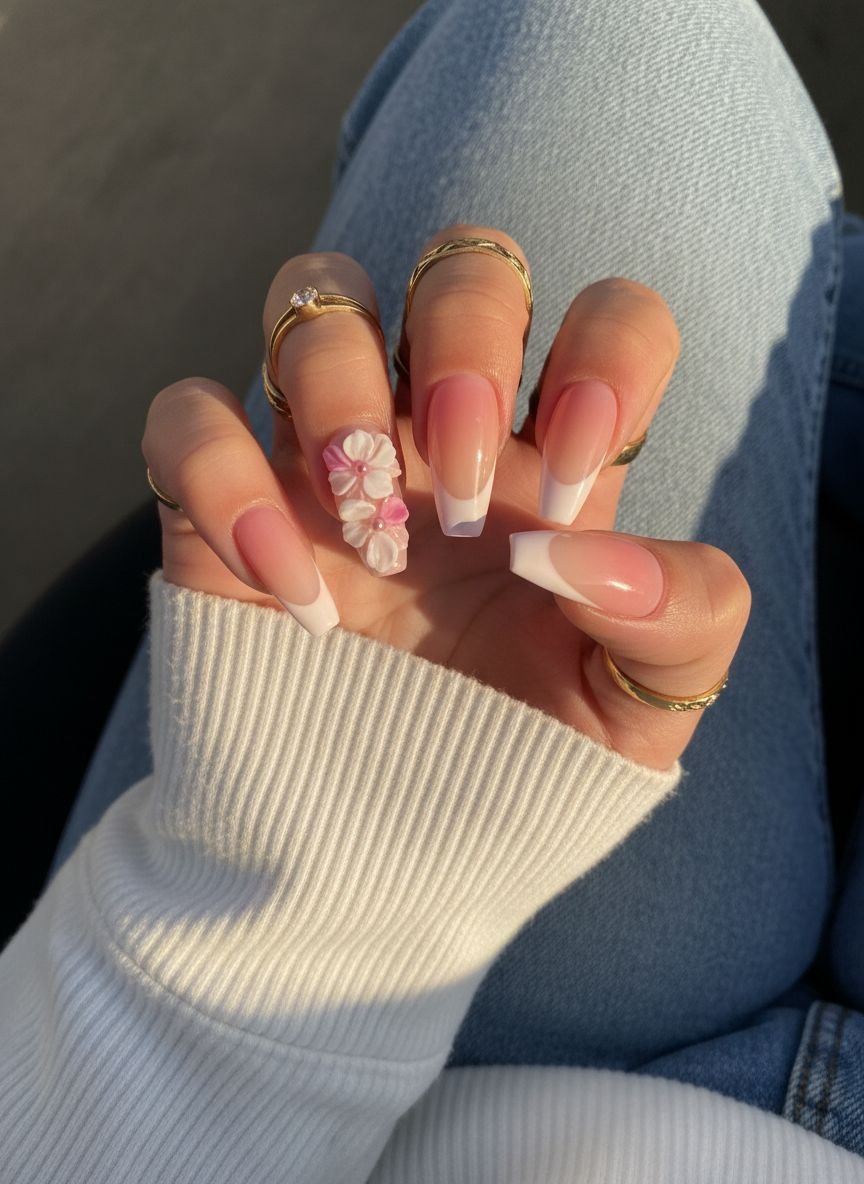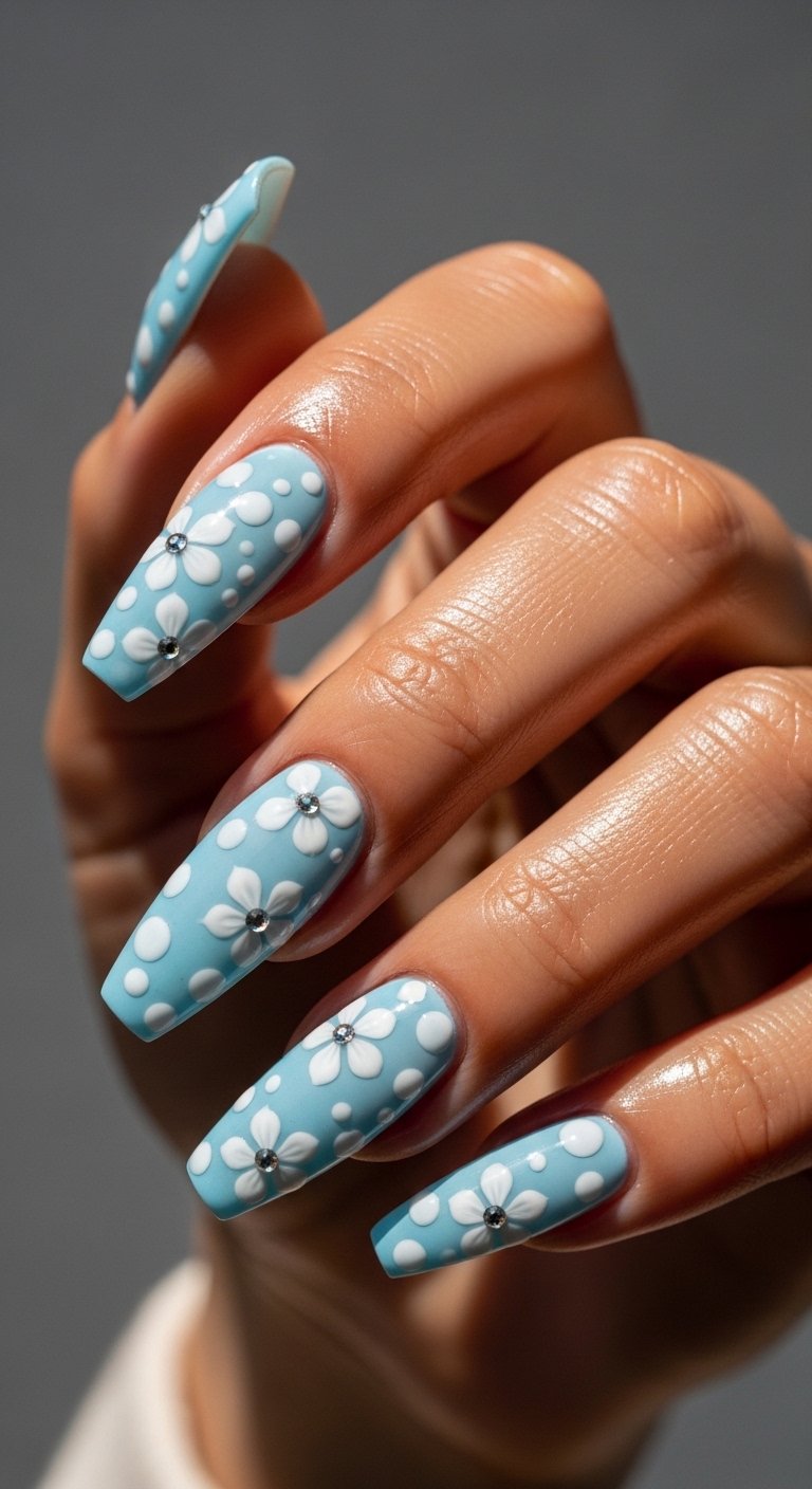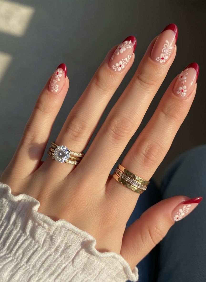 The aesthetic here is “quiet luxury.” It is less about flash and more about artistry. A popular execution is a matte sage green base with white or cream floral outlines. This earthy palette connects with the nature-inspired trends of 2026. However, be aware that matte top coats can show sunscreen stains more than glossy ones. To maintain the pristine finish, wipe your nails with an alcohol pad after applying lotions.
