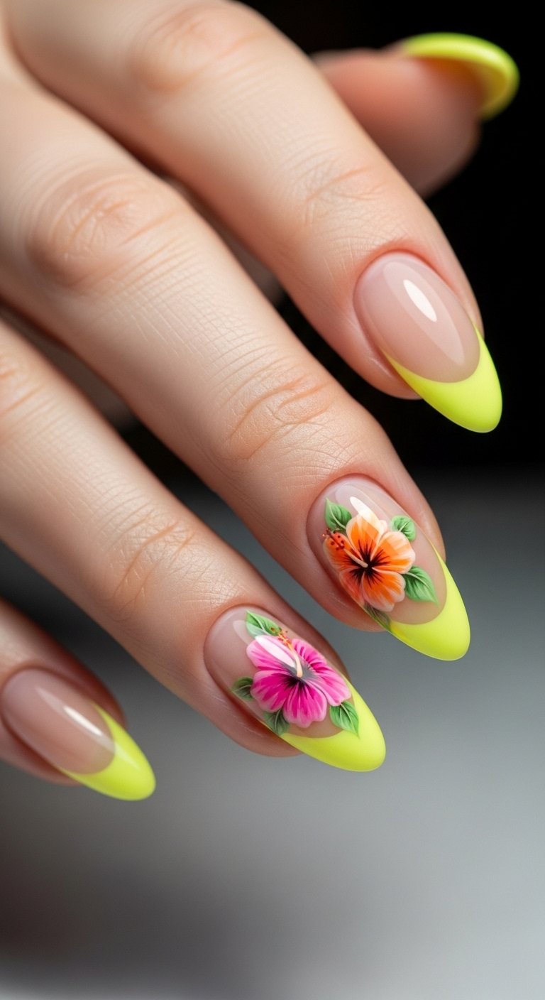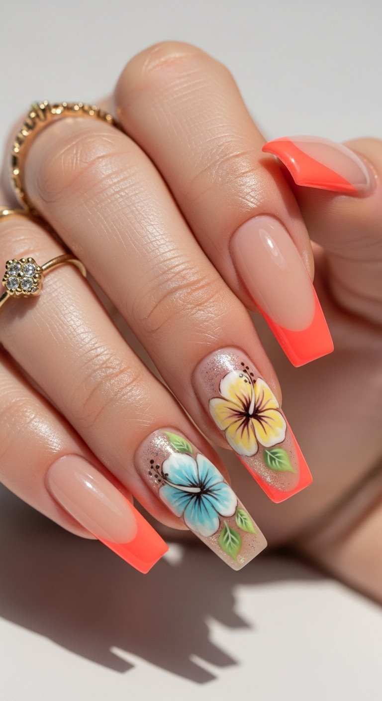 The Y2K revival is still going strong, and nothing says early 2000s surf culture like the hibiscus flower. “Hibiscus Crush” modernizes this iconic symbol with airbrushed techniques and bold color combinations. Instead of the flat stickers of the past, 2026’s hibiscus is soft, dreamy, and often layered over a French tip. Think hot pink flowers on a lime green tip, or white airbrushed blooms on a baby blue base.