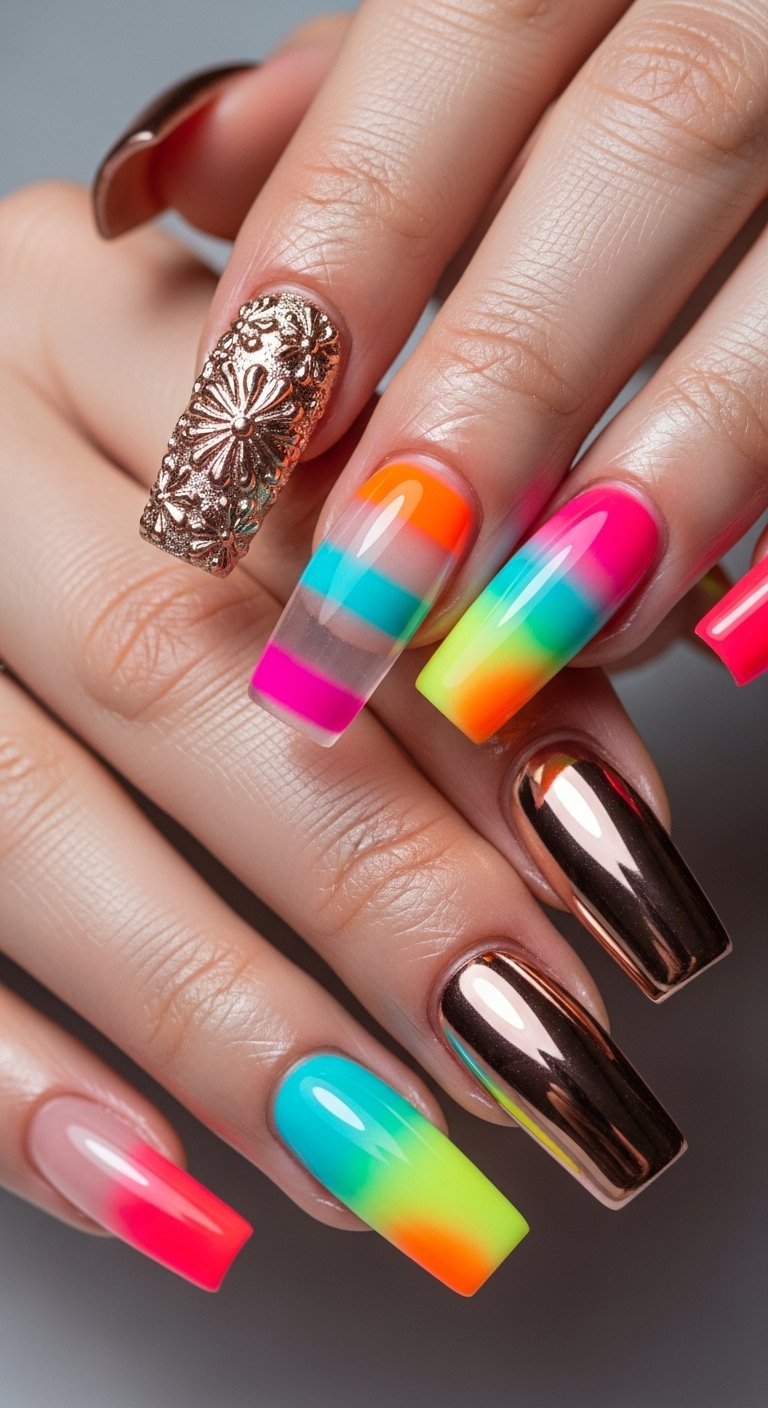 This design taps into the “Molten Metal” trend, where metallic accents are applied in raised, irregular textures. You can achieve this 3D effect using a thick builder gel mixed with chrome powder. It adds a tactile element to your nails that is incredibly satisfying. The dark background serves as a dramatic contrast to typical bright vacation colors, making it a unique choice for evening events or beach parties.