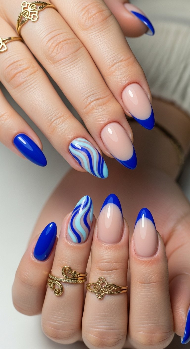 This design captures the raw energy of the ocean with fluid, organic lines that mimic crashing waves. Unlike the rigid geometric patterns of the past, the “Ride the Wave” look relies on negative space and swirling blues to create movement. You start with a sheer nude or “milky” base—a massive trend for 2026—which ensures that regrowth remains invisible during a long trip. Over this, different shades of cobalt, turquoise, and white are painted in abstract curves.