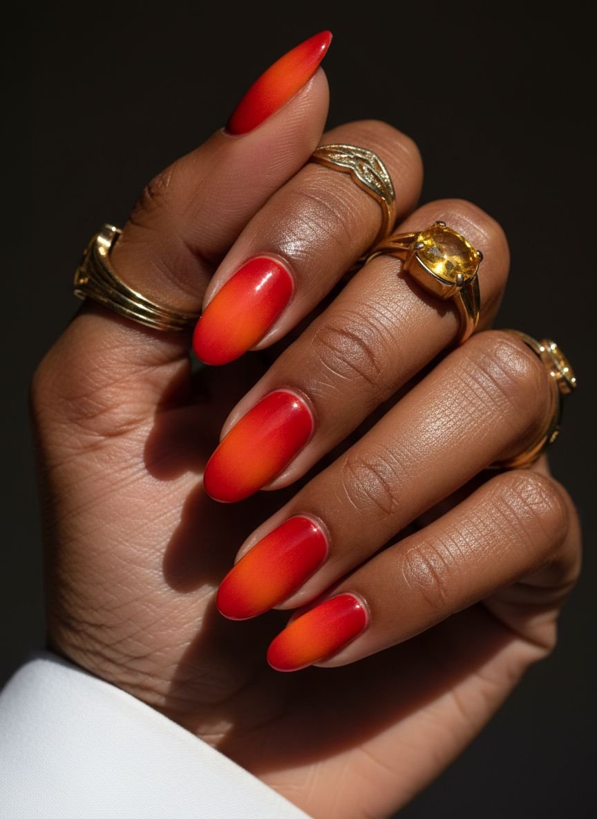 Gradient nails have evolved into the sophisticated “Aura” trend, and “Sunrise, Sunset” is the tropical iteration of this style. This design features a seamless blend of colors that replicate the sky at golden hour—fading from deep violet to fiery orange and soft yellow. The transition should be imperceptible, creating a soft-focus effect that looks like it was airbrushed.