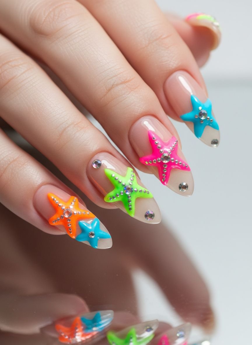 Celestial themes meet the ocean in the “Lucky Stars” design. This look incorporates starfish motifs, often drawn in a stylized, minimalist way that resembles twinkling stars. The background is usually a deep, translucent navy or a shimmering “night swim” black, representing the ocean after dark. The starfish are painted in gold or silver chrome, catching the light like bioluminescence in the water.