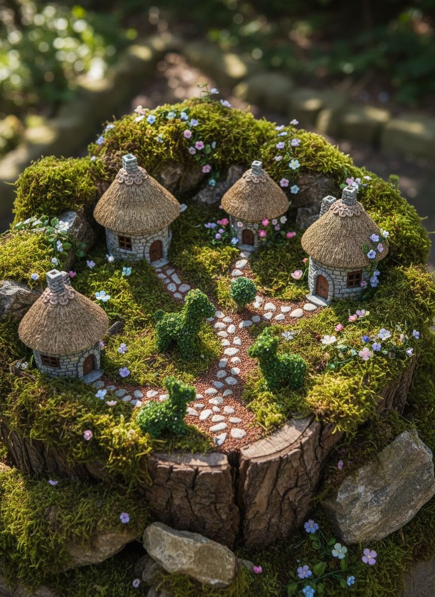 Fairy gardens add a layer of whimsy and discovery. These are miniature landscapes tucked into planters, tree stumps, or hidden corners of flower beds. Use small-scale plants like creeping thyme, baby tears, and miniature succulents to simulate full-sized trees and bushes. Add tiny accessories: a pebble path, a twig house, or a bridge made of popsicle sticks.