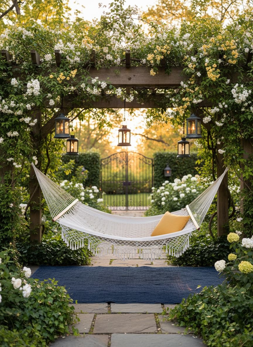 Relaxation requires comfort and scent. A chamomile lawn offers both. Roman chamomile creates a thick, apple-scented mat that releases fragrance when you walk on it. It stays low and requires no mowing. Install a sturdy hammock stand or hang a hammock between two mature trees directly over this fragrant carpet. The scent wafts up as you sway, creating a natural aromatherapy session.