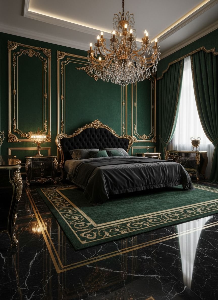Emerald green acts as your jewel tone highlight. Use emerald throw pillows, a vintage green glass lamp, or a plush area rug. The green breaks up the black void and adds a sense of regal history. Antique gold frames for mirrors or artwork reflect light and amplify the romantic atmosphere. The gold warms up the cool black and green tones instantly.