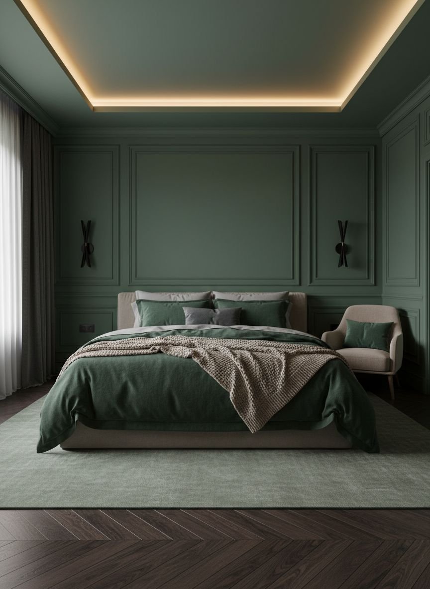 Zen design focuses on flow and balance. Dark colors can actually enhance this by removing visual distractions. Use a very dark, desaturated green that almost reads as black. This color mimics the shadows found in nature. Keep the furniture profile low. A platform bed with no headboard or a simple tatami mat style works best.