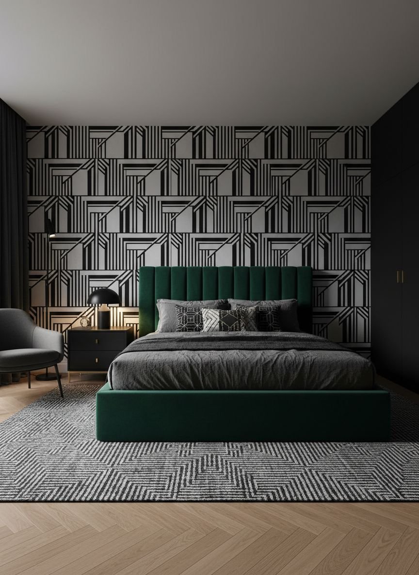 The 70s are back with a moody twist. Dark avocado green and black create a groovy yet sophisticated base. Look for furniture with curves. A curved velvet sofa or a rounded headboard softens the room. Geometric patterns are key. A wallpaper featuring bold black and green geometric shapes makes a powerful statement wall.