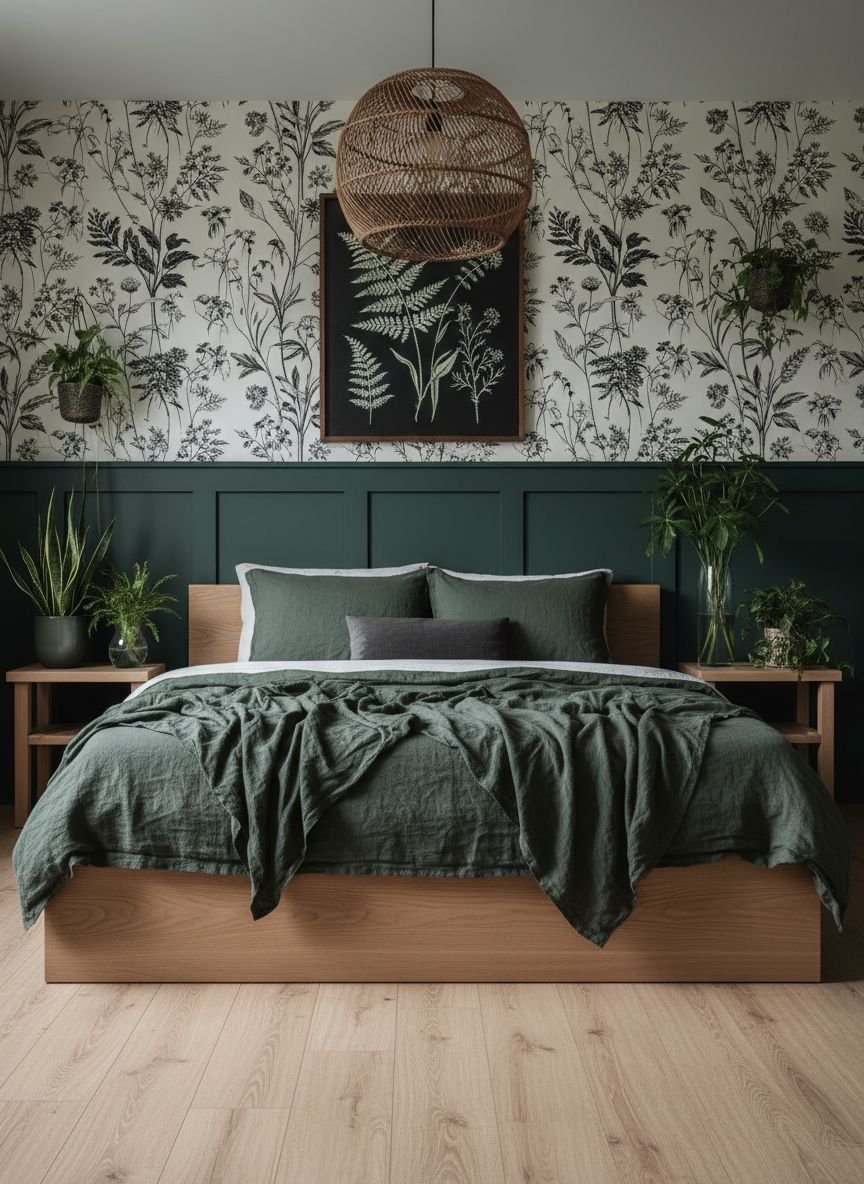 A bedroom should feel like a living ecosystem. You can achieve this by pairing deep forest green walls with rich walnut or mahogany wood tones. The wood adds warmth that cuts through the visual weight of the green paint. Large leafy plants like a Fiddle Leaf Fig or a Monstera Deliciosa serve as living sculptures here. Their vibrant organic green pops against the darker, moodier wall color.