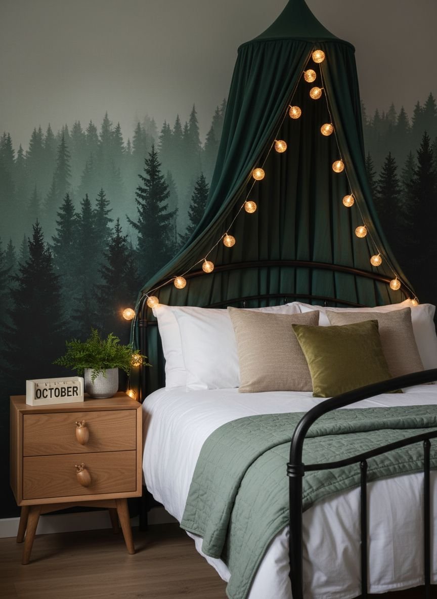 Bring the magic of a twilight forest indoors. This look relies on lighting to create the “enchanted” feel. String lights or fairy lights draped over a black canopy bed create a starry night effect. Use a dark green wallpaper with a subtle botanical print instead of solid paint. The pattern adds movement to the walls.