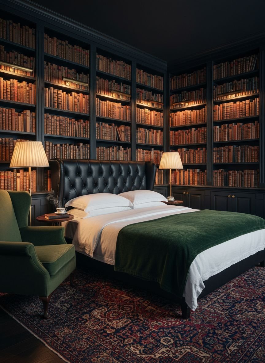 Furniture should be timeless. A wingback chair or a wooden four-poster bed fits perfectly. darker woods like cherry or mahogany look stunning against hunter green. Use symmetry in your layout. Matching nightstands and matching lamps on either side of the bed create a sense of order and calm. Touches of black appear in picture frames or small hardware details.