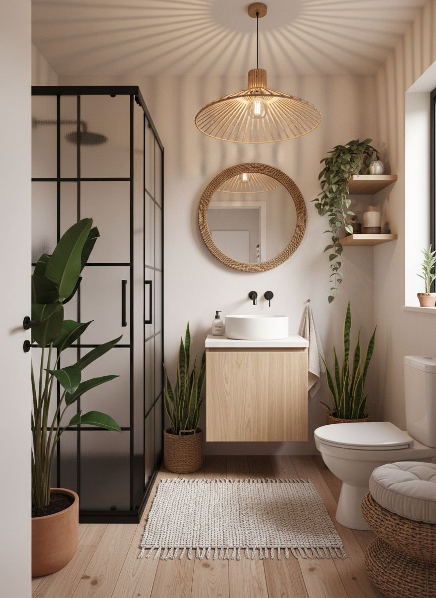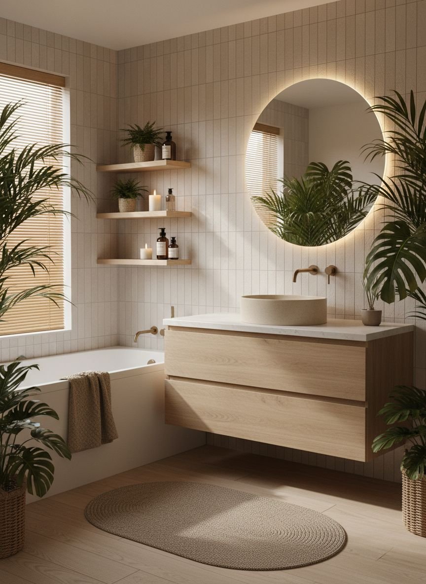 Pro Tip: Incorporate a wooden slat wall or a bamboo bath mat. The linear wood texture is a hallmark of Japandi design and adds warmth to the walls or floor.