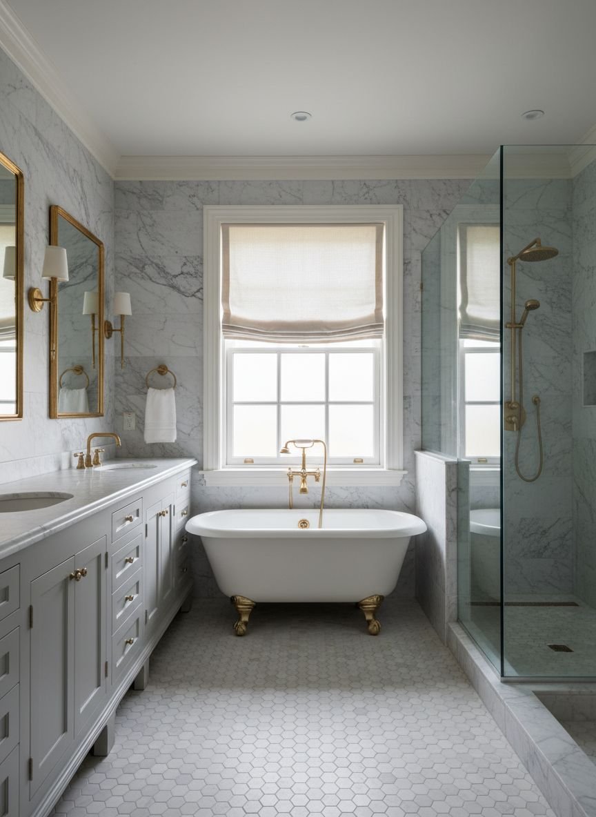 The finish matters here. Avoid shiny, yellow-lacquered brass which can look cheap. Opt for “champagne bronze,” “aged brass,” or “unlacquered brass” which develops a patina over time. You do not need to change every single metal element; mixing metals is a chic design move. For example, you can keep a black shower frame but use brass for the vanity hardware and light fixtures. This layered approach feels custom and high-end.