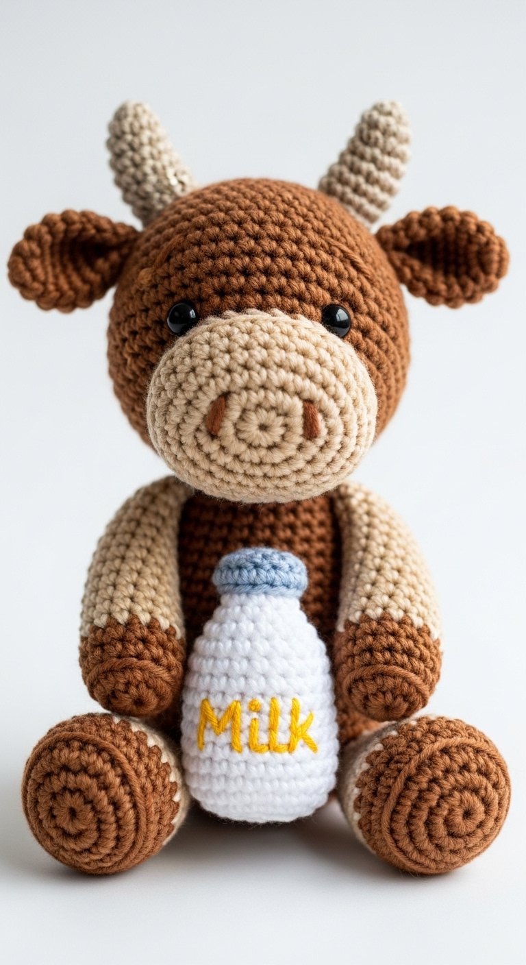 This pattern adds a prop to the mix. The cow itself is usually in a seated position, with arms specifically designed to clasp a miniature milk bottle.