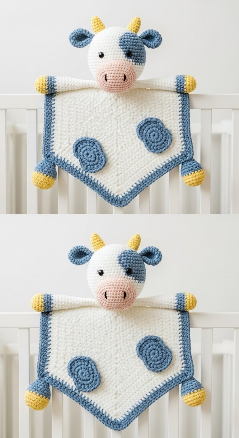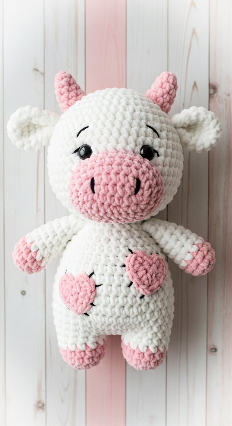 Texture is the headline here. Using yarn like Bernat Velvet or Hobbii Baby Snuggle, this cow is luxuriously soft.