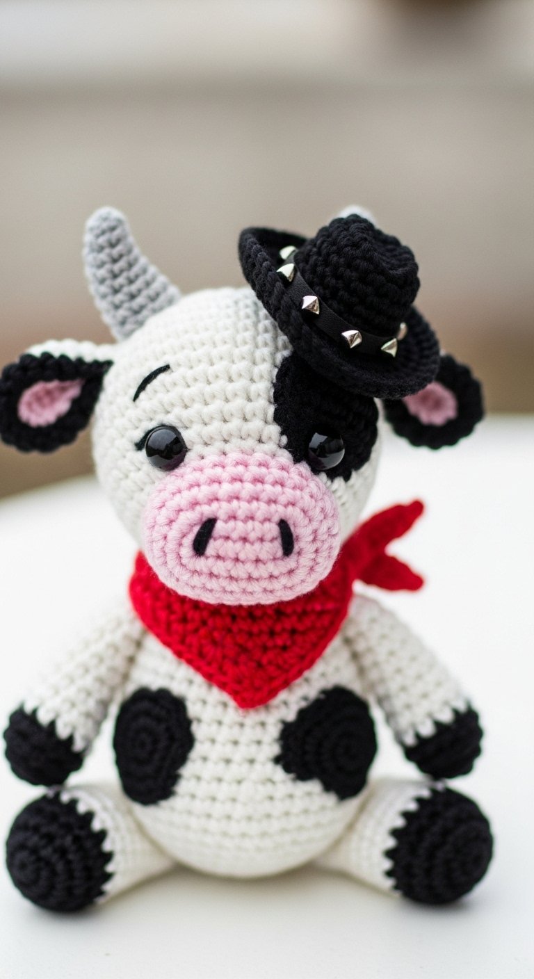 Inspired by milk cartons and dairy branding, this cow often features a square-ish body shape or holds a tiny crocheted milk carton.