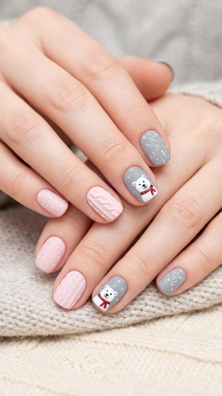 The “sweater nail” trend returns every winter because it adds incredible texture. This variation uses a soft pastel pink and a cool-toned grey. The 3D texture mimics the cable knit pattern of a wool sweater. It looks cozy and soft. The matte finish is mandatory here; a glossy top coat ruins the fabric effect. This style is tactile and visually interesting, proving you do not need bold colors to stand out.